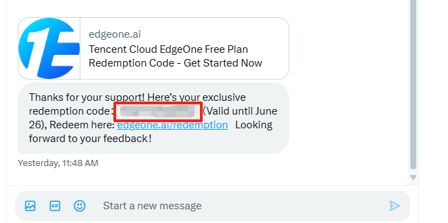 Hello, the promotional tweet has been sent. Can you give me a redemption code to experience the free package of Tencent EdgeOne?