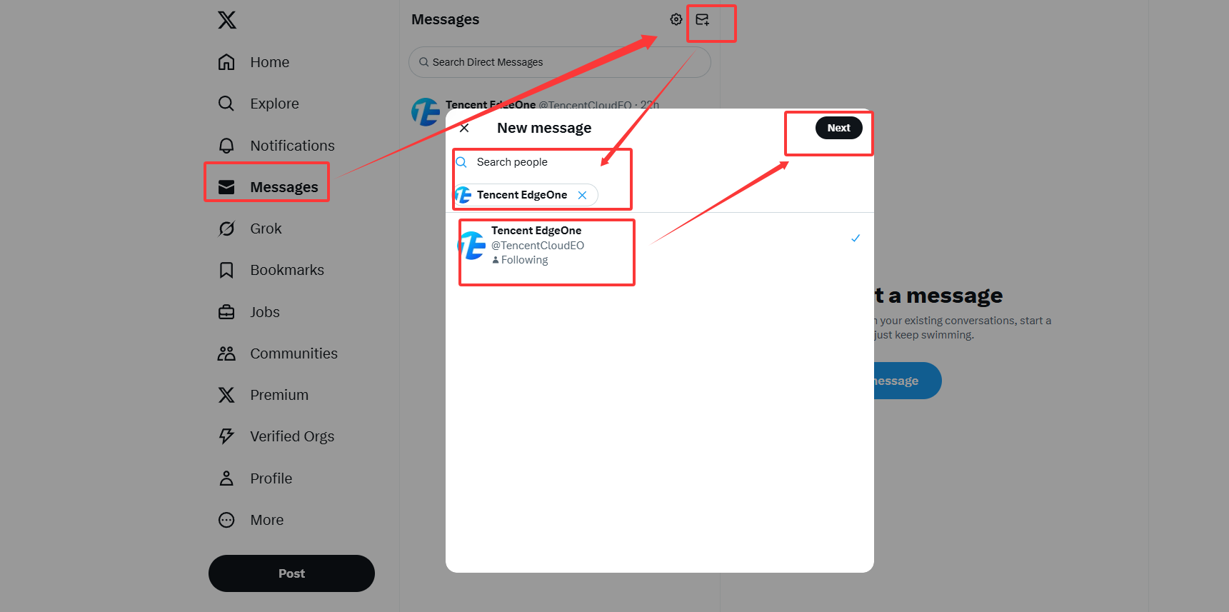 点击messages,再上方New messages图标,输入Tencent EdgeOne搜索,找到官方账号,然后点击Next