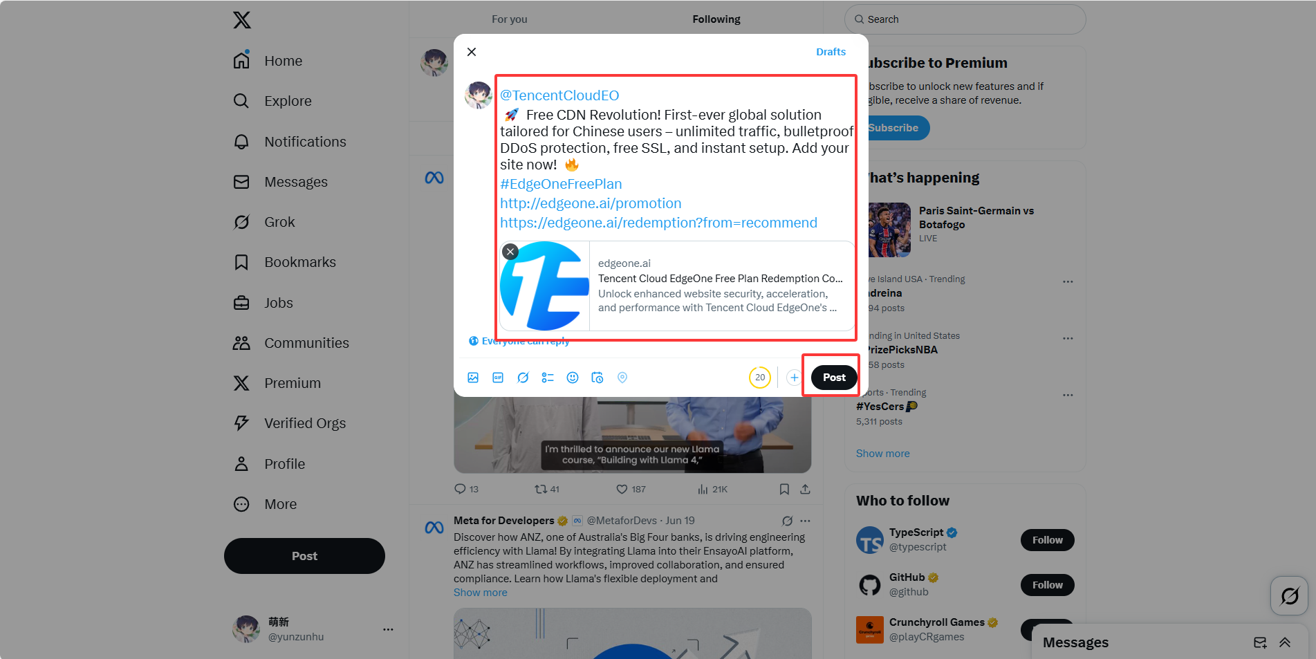 在X平台发布一条EdgeOne推广推文